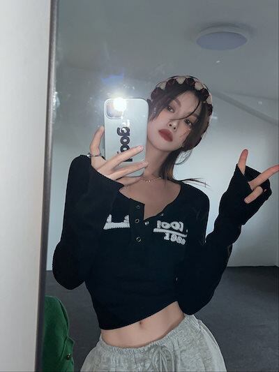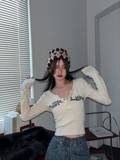 2024秋冬トップス ヘンリーネック ショート丈 ロンT スリムフィット tシャツ ロゴプリント 長袖 レトロ 韓国ファッション レディース
