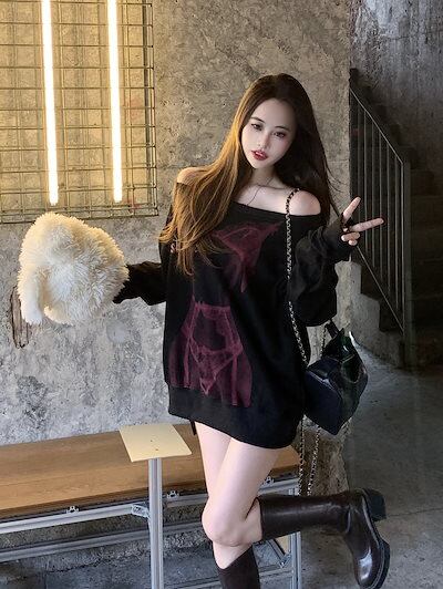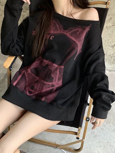 2024秋冬オフショルダー トップス セクシープリント スウェット オーバーサイズ ロンT トレーナー 長袖 韓国ファッション レディース