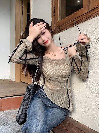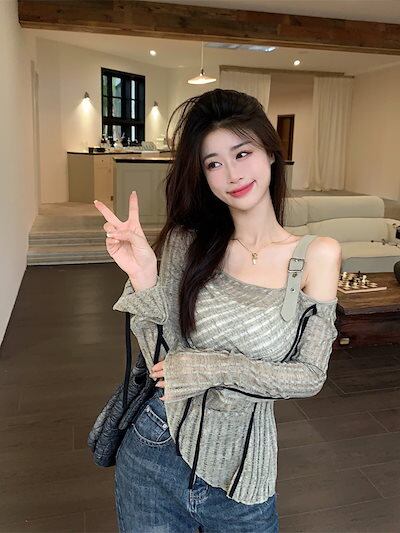 2024 秋冬 韓国 女度を格上げ tシャツ ファッション トップス 韓国系 長袖 ショート薄手フィット プリント レイヤード 重ね着 肌見せ 女っぽハイフレンチ タイト丈 レディース T
