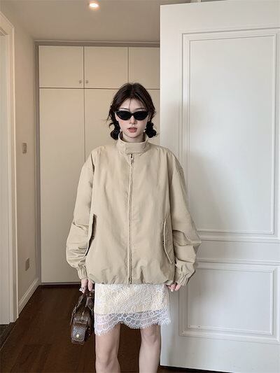 2024秋冬アウター ショートコート トレンチ ハイネック ジップ チャック 長袖 秋 ベージュ おしゃれ かわいい 韓国ファッション レディース お出かけ