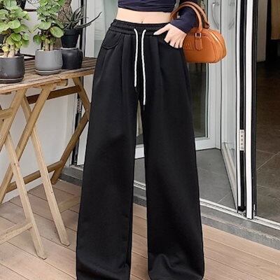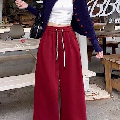 2024 春秋パンツ ロング丈 ワイド ストレート ウエストゴム ハイウエスト 美脚効果 脚長効果 細見え 秋 赤 白 黒 おしゃれ かわいい 韓国ファッション レディース お出かけ