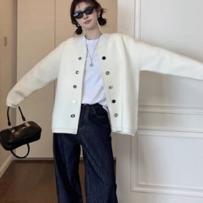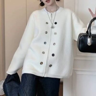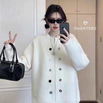 2024秋冬トップス ニット カーディガン ダブルボタン ラウンドネック ジップ チャック 長袖 秋 白 ホワイト おしゃれ かわいい 韓国ファッション レディース お出かけ