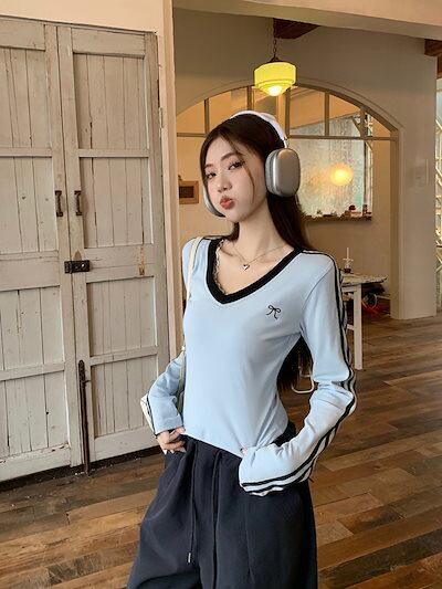 2024 秋冬トップス Tシャツ 長袖 Vネック ストライプ Vネック スリム 細見え 秋 ライトブルー おしゃれ かわいい 韓国系ファッション衣装 レディース お出かけ