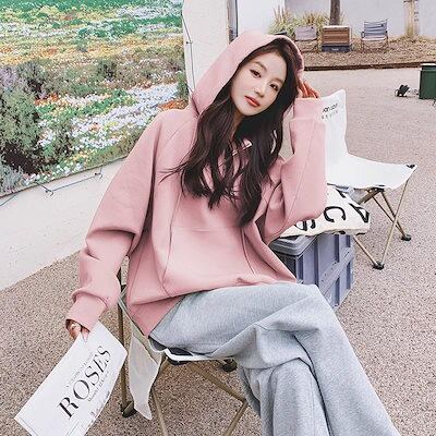 韓国ファッション フー 百掛け スウェット レディース ゆったり長袖 トップス ロング パーカー レディース シンプルアウター