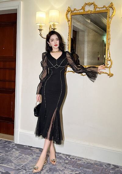 キャミワンピースワンピース ドレス パーティードレス Vネック ロングワンピース フィッシュテールワンピース メッシュ スリミング セクシー 披露宴 結婚式 演奏会 ウェディング 二次会 発表会 タイ