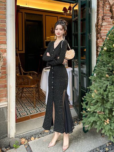 パーティードレス秋冬 ニット 弾力 タイトスカート 長袖 気質 百掛け フィッシュテール ワンピース 演奏会 二次会 ニットワンピース