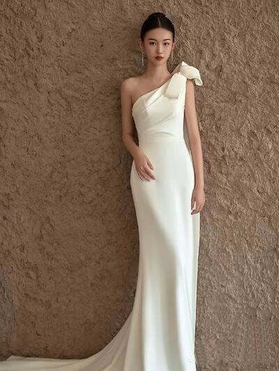 パーティードレスシングルショルダー ホワイト サテン ウエディングドレス キャバドレス 結婚式 ドレス ロングドレス