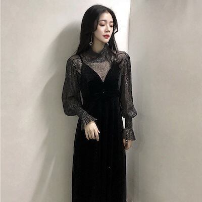 パーティードレス2024春夏 スリミング メッシュ セクシー 長袖 レトロ 透かし彫り 2点セット キャミソール ワンピースおしゃれ 百掛け