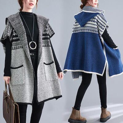 ニット ベスト 半袖ベスト アウター ドルマン フード スリット 花柄 アウター ノースリブ 半袖 コーディネート カーディガン ポケット付き ロングベスト 大きめ レディース 体型カバー 春秋