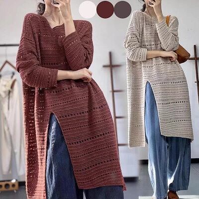 ニット レディース 長袖 春 夏 前後差 重ね着 透かし編み 透かしニット スリット ゆったり チュニック ロング オーバーサイズ 大きいサイズ