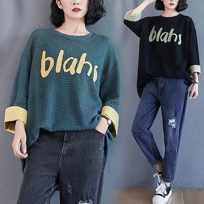 ニット セーター ロゴ プリント クルーネック ロング 長袖 ビックシルエット 体型カバー ゆったり オーバーサイズ レディース 透け 春 秋