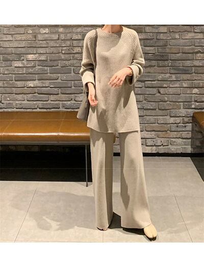 2023 秋冬 2点セット スリット セーター ストライプ ニットカーディガン レディース トップス ロングズボン あたたまること セット