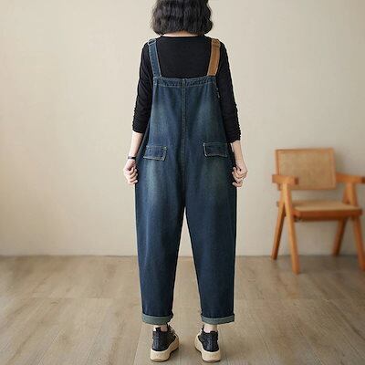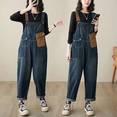 デニムサロペット 韓国ファッション コントラストカラー 2024 春秋 新作 ゆったり 9分丈パンツ ワイドパンツ レディース オールインワンパンツ