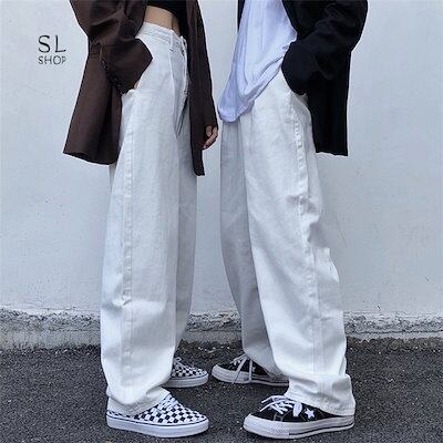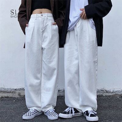 パンツ レディース メンズ デニム ワイドパンツ ジーンズ Gパン 白パンツ ロング丈 ボトムス 男