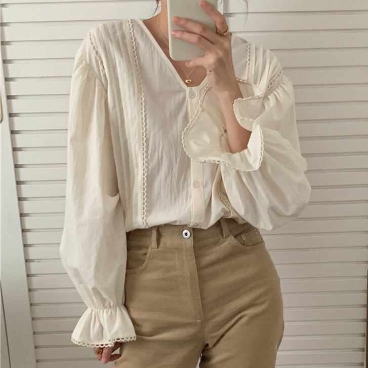 韓国風 ブラウス トップス レディース 人気シャツ 長袖 2024年秋冬新作 Sweet系 Vネック