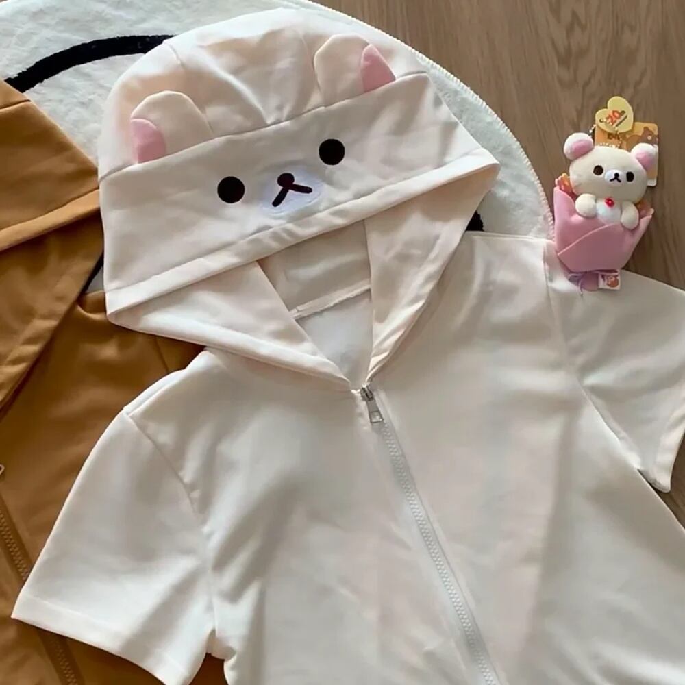女性用ベアイヤー長袖フード付きスウェットシャツ、カワイイコート、甘いy2kプレッピースタイル、日本のTシャツ、ジッパーコート、スリムフィット、夏 パーカー ジャージ y2k T240908201257_02