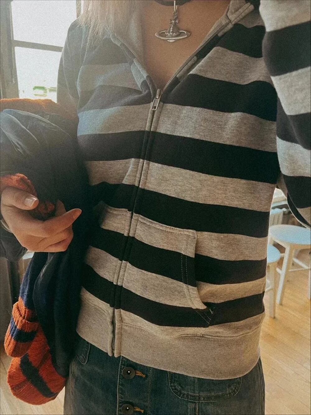 女性のストライプのジップアップパーカー、コットンポケット、フード付きスウェットシャツ、ヴィンテージパッチワークルーズジャケット、カジュアルストリートウェア、秋のトップス、y2k パーカー ジャージ y2k T240908201759_02