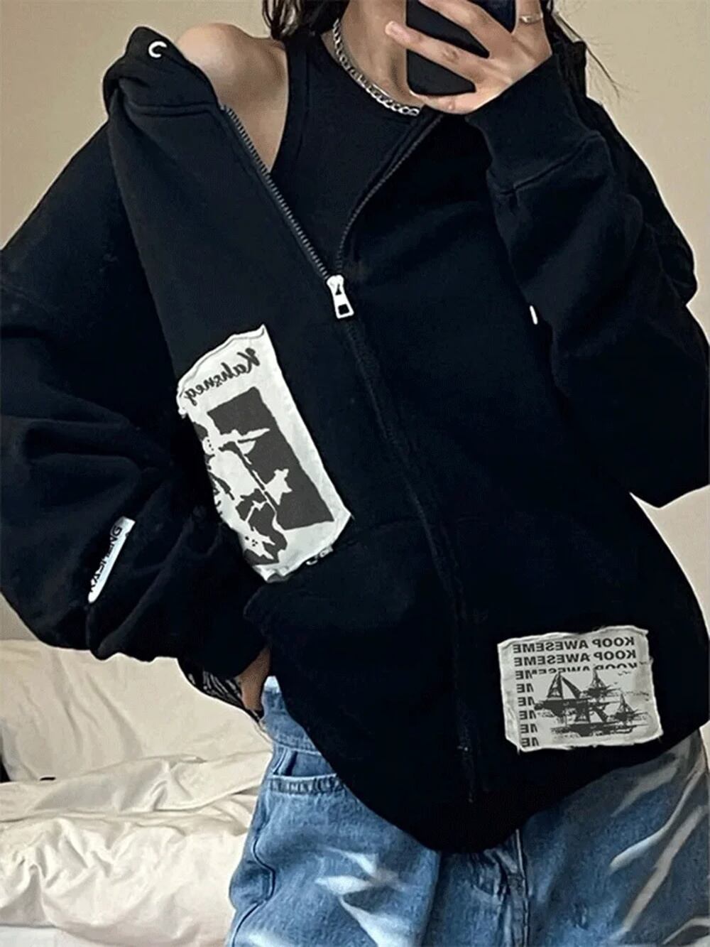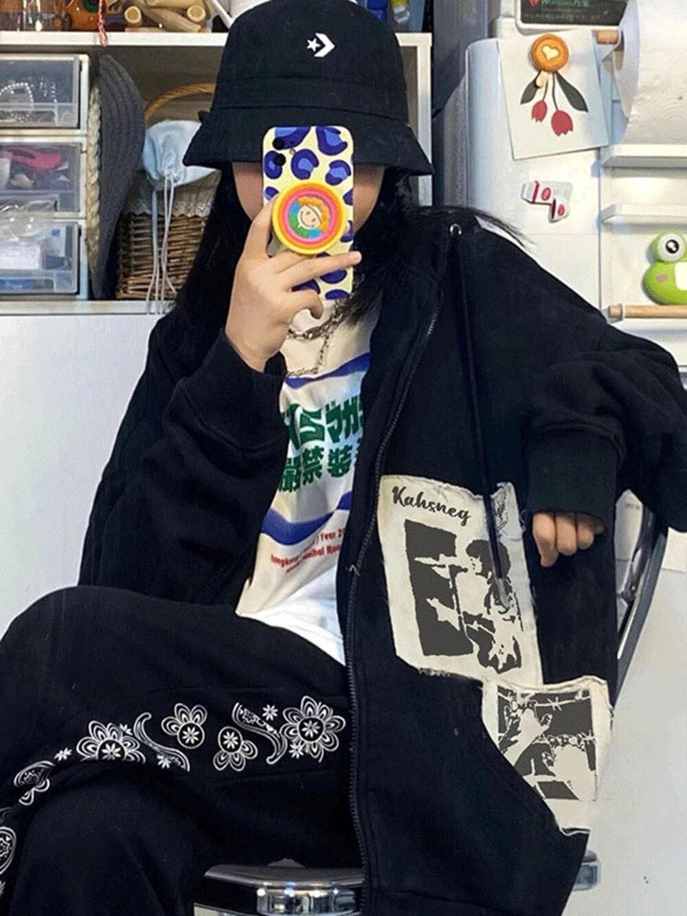 女性のレトロなパッチジップアップパーカー,原宿y2kストリートウェア,ユニセックスフード付きスウェットシャツ,薄いゆったりとしたトップス,グランジファッション,秋 パーカー ジャージ y2k T240908201824_02