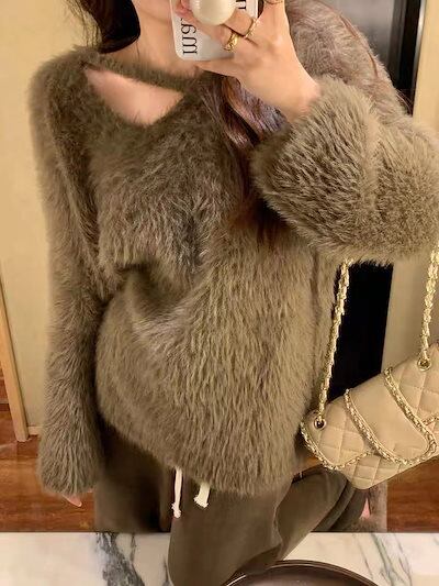 人気なリブニット ベーシックニットふんわり モテ質感 暖かい 冬 長袖トップス 可愛い カシミヤタッチ ニット セーター レディース 怠惰な風ゆったりニット Vネック 百掛け着痩せ