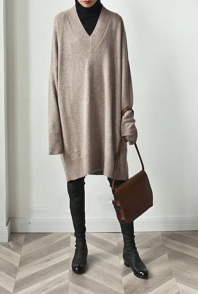 人気なリブニット ベーシックニット カシミヤタッチ 秋冬Vネックニットセーターレディースミドル丈厚手ゆったりセーターニットワンピース裹起毛 長袖トップス 大きいサイズ 体型カバー