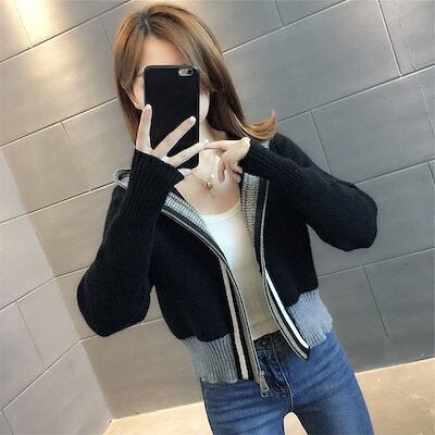 春新作 ショート丈 ニットカーディガン チャック フード付きセーター レディースファッション アウター トップス30%までに制限