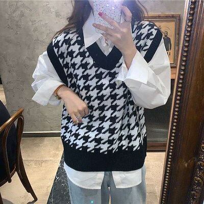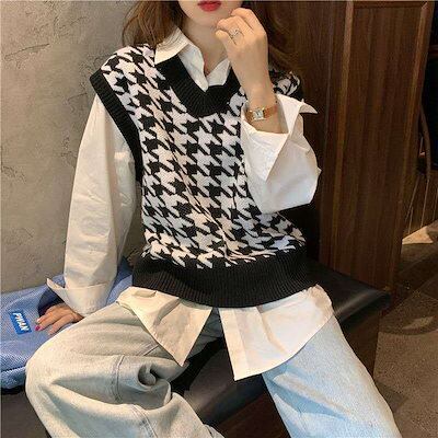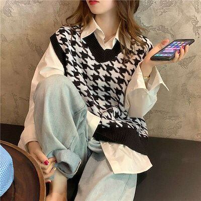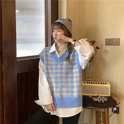 ニットベスト 韓国 新ルーズ韓国風アウターセーターベストジャケット千鳥格子ベストレディースアウターウェアニットベスト レディース服