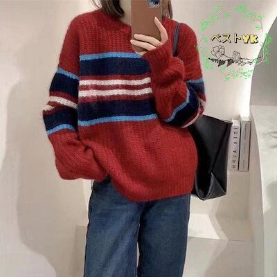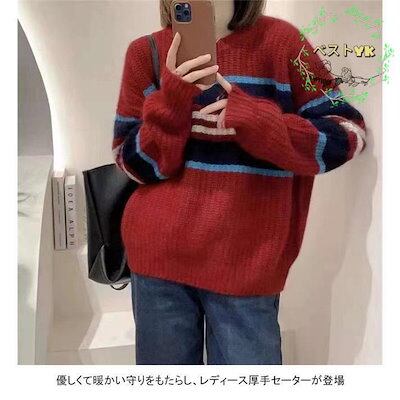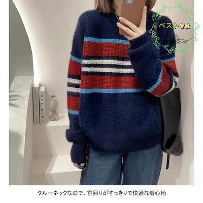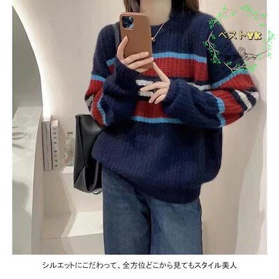 ニットセーター 長袖 セーター レディース ニット クルーネック ソフト ボーダー柄 プルオーバー 厚手 トップス アウター おしゃれ シンプル ゆったり
