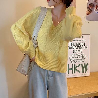 韓国ファッション ニットセーター レディース Vネック長袖 アウター ショット丈 プルオーバー