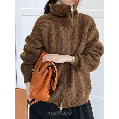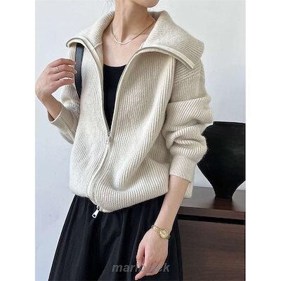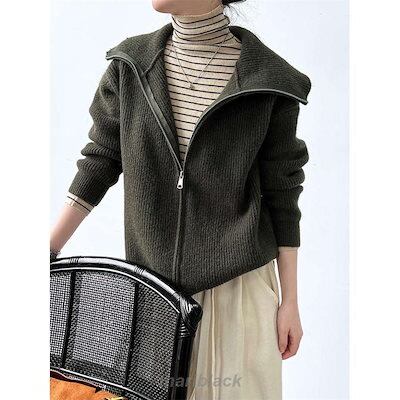 ニット レディース 秋 冬 セーター 長袖 カーディガン ジャケット アウター コート リブニット 羽織り スタンドカラー ジッパー 2way 厚手 防寒 セーラーカラー