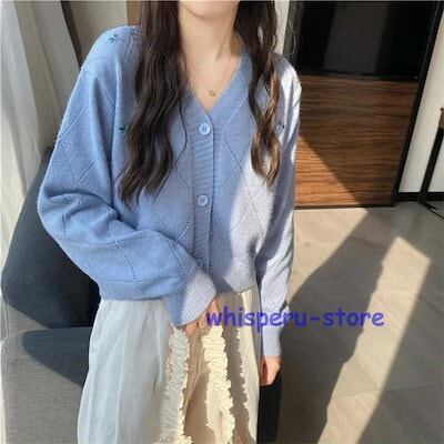 レディース トップス カーディガン ニット 秋 長袖 ブルー ベージュ ライトニット ゆったり カジュアル ファッション 通勤 普段着