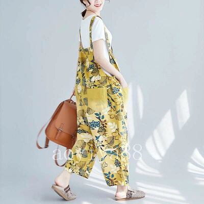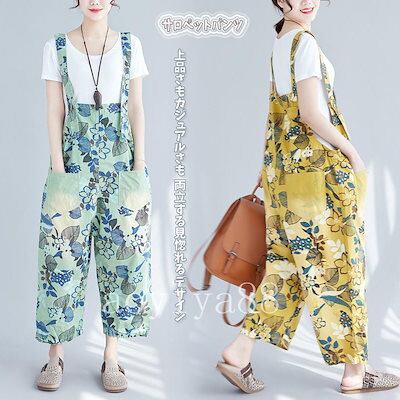 サロペット オーバーオール レディース 花柄 大きいサイズ ゆったり カジュアル ワイドパンツ 7分丈