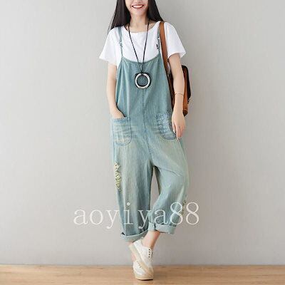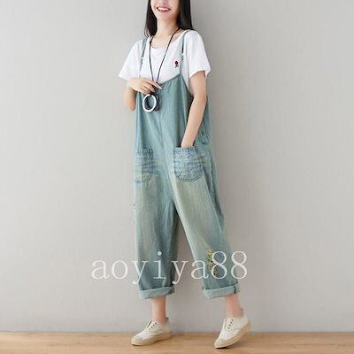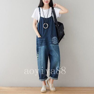 大きいサイズ サロペット オーバーオール レディース デニム ジーンズ ロングパンツ ダメージ着痩せ