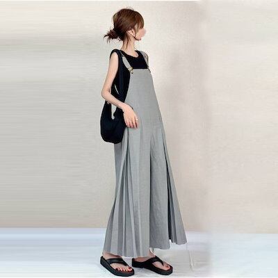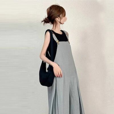 プリーツサロペット レディース オールインワン ロングパンツ ワイドパンツ オーバーオール ガウチョパンツ 夏服 カジュアル ゆったり 可愛い 体型カバー オシャレ 大人 切り替え キャザー 春 夏