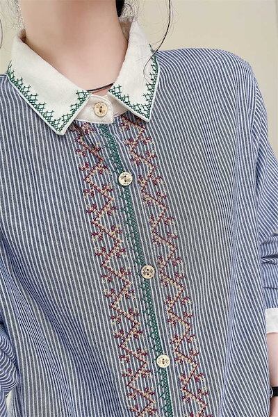 シャツ ブラウス 刺繍 新作 ストライプ 幾何柄 長袖 ガーゼ 綿 コットン 折り襟 シャツブラウス トップス レディース シンプル 前開き 春 秋 ゆったり 体型カバー 着?せ カジュアル レトロ