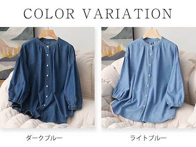デニムシャツ 半袖 七分袖 ブラウス 襟付き シャツ レディース デニム 綿 トップス シャツブラウス 春 夏 綿シャツ 半袖シャツ 半袖ブラウス 折り襟 ギャザー 無地 大きいサイズ テンセル ゆっ