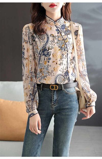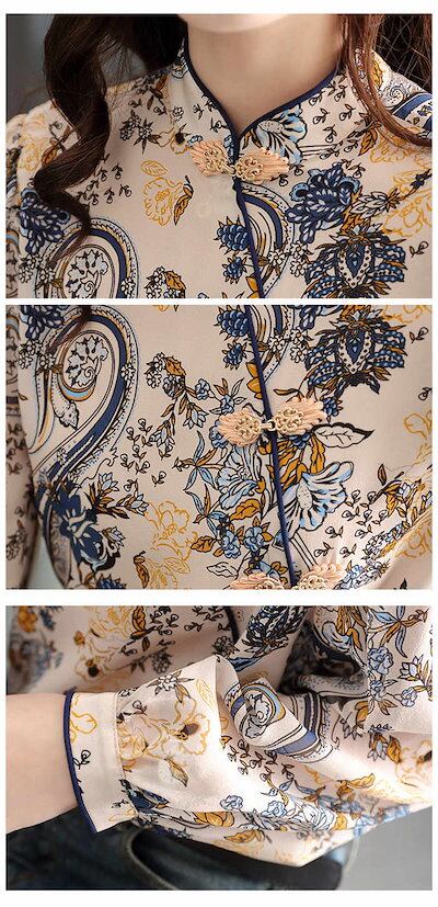 ブラウス シャツ 長袖 チャイナ シャツ トップス 花柄 チャイナシャツ とろみシャツ レディース 立ち襟 ハイネック 花柄 おしゃれ かわいい チャイナボタン 春 秋 冬 シャツ シンプル エレガン
