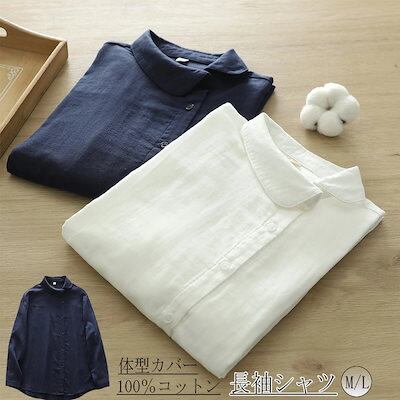 シャツ ブラウス 綿シャツ 白シャツ レディース 長袖 春 無地 ガーゼシャツ トップス インナー カットソー 二層ガーゼ 春 ホワイト 折り襟 チュニック 重ね着 可愛い 体型カバー シャツブラウス