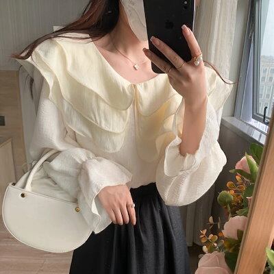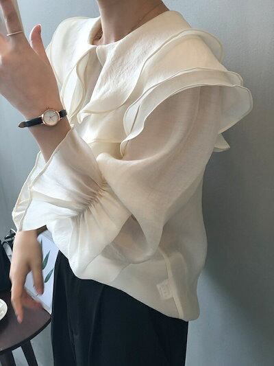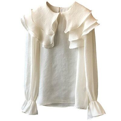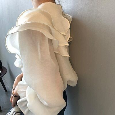 ブラウス ビッグカラー ボリューム袖 フリル襟 レディース フリル袖 長袖 きれいめ フォーマル トップス 透け感 シアー 春 夏 細見え オフホワイト ボリュームスリーブ