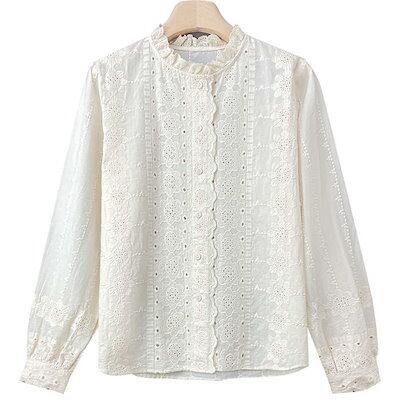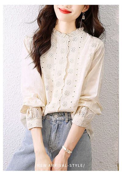 レース シャツ 襟フリルブラウス シャツトップス レディース 春 長袖 立ち襟シャツ 花柄 刺繍 透け感 スタンドカラー ボリューム袖ブラウス 前開き ボタン 薄手&厚手 裏ボア きれいめ ゆったり