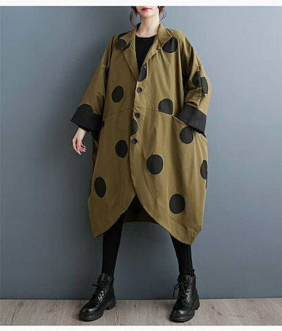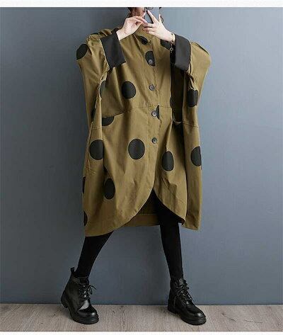 コート レディース 春秋 トップス カーディガン ポケット付き 総柄 ドット柄 前開き 羽織り ボタン 立ち襟 ロングコート ロング丈 ドットコート カジュアル シンプル アウター レイヤード 重ね着