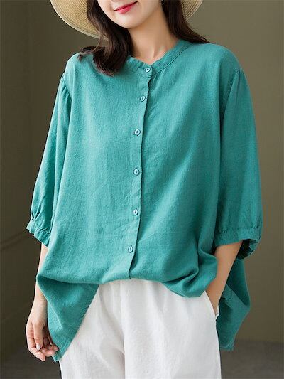 シャツ ブラウス レディース トップス 綿麻 立ち襟ブラウス 七分袖 コットンリネン 森ガール系 体型カバー 前開き 無地 ブラウス ゆったり 大きいサイズ 春 夏 新作 体型カバー シンプル 綿麻混