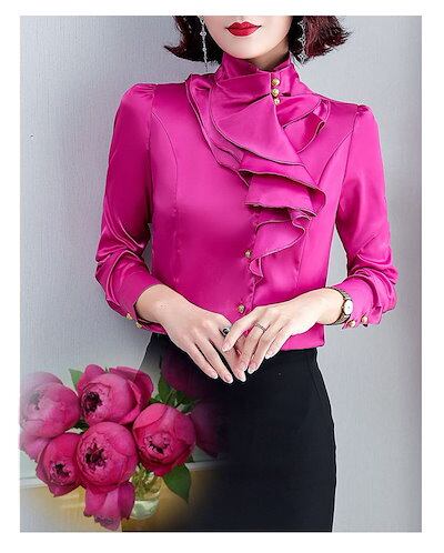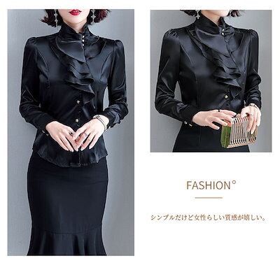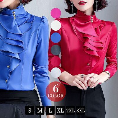 フリルブラウス 長袖 襟付 シャツ レディース トップス オフィス カジュアル オシャレ かわいい 春 秋 シフォン ホワイト ブラック 白 黒 レッド 立ち襟 エレガント 優雅 通勤 OL 謝恩会