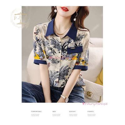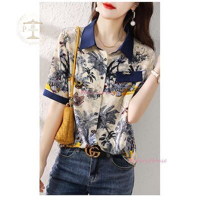 ブラウス レディース 半袖ブラウス 夏 オフィスブラウス プリント 配色ポロ襟 オシャレブラウス シフォントップス 韓国風 大人 通勤OL ゆったりシャツ 40代 30代