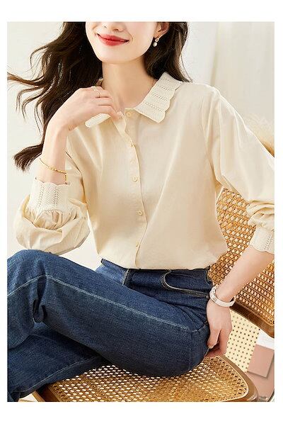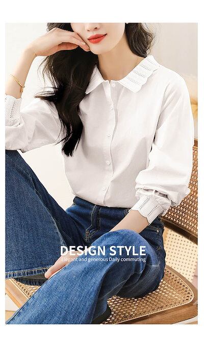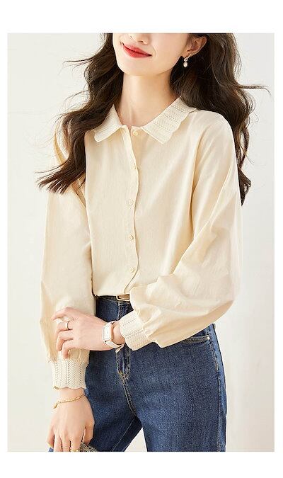 ブラウス 長袖 レディース シャツ 襟レース シャツブラウス 春秋 チュニックブラウス トップス レース コットン 無地 長袖シャツ 柔らか ゆったり 着痩せ ベーシック ホワイト 白 ベージュ エレ
