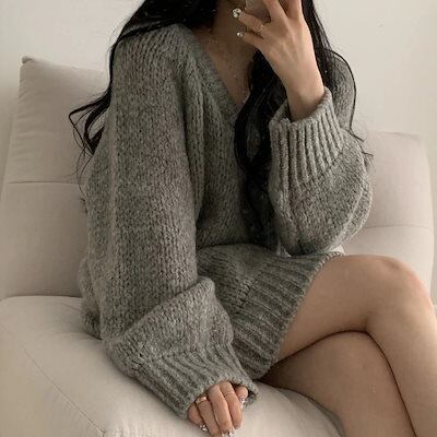 レディース セーター V字ネック ニット セーターカシミヤタッチ カジュアル ロング丈セーターベーシ人気なリプニット