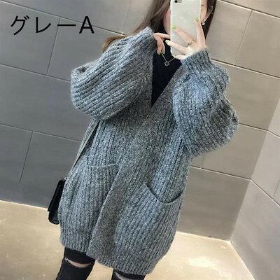 ニット レディース カーディガン トップス 長袖 ポケット付き カットソー 無地 厚手 オフィス アウター 大きいサイズ ゆったり カジュアル 黒 春 冬 秋