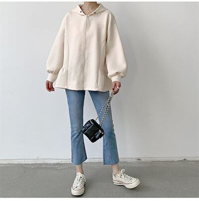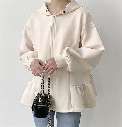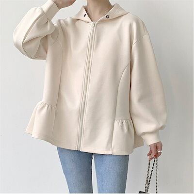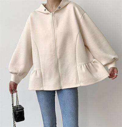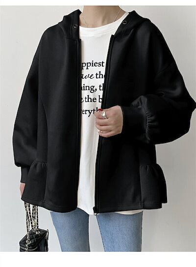パーカー レディース 秋冬 カーディガン ジャケット スウェット 裾フリル 長袖 ショート丈 前開き 羽織 フード付き アウター トレーナー 厚手 大人 暖かい 柔らかい 軽量 防寒 シンプル 無地