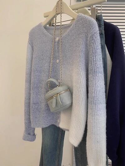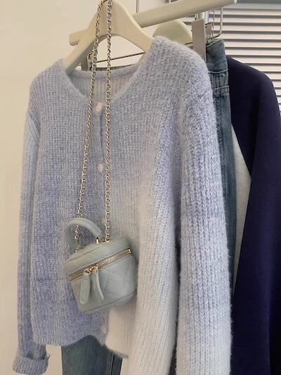 早秋ブルー染めグラデーションニットカーディガンレディース春秋アウターふんわり高級感セーターコート