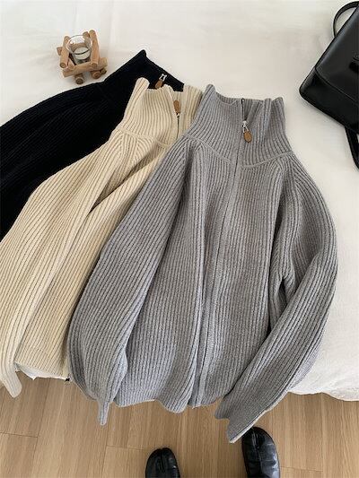 気品シンプル2頭ファスナー開襟セーター女性ゆったり着やせ肩出し袖厚手ニットカーディガン秋冬アウター