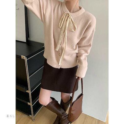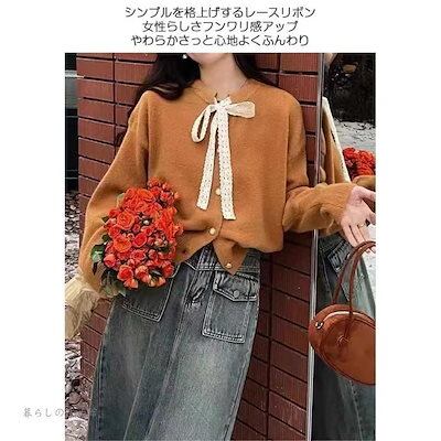 レース 羽織り ラウンドネック リボン 着回し レディース カーディガン 長袖 ポールボタン コート ニットカーディガン レイヤード ニット セーター アウター